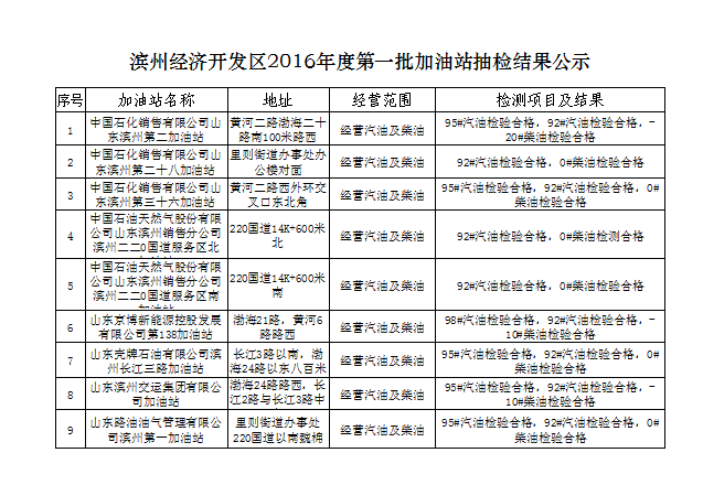 滨州经济开发区2016年度第一批加油站抽检结果公示